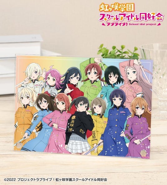 高咲 侑、上原歩夢、中須かすみ、桜坂しずく、朝香果林、宮下 愛、近江彼方、優木せつ菜、エマ・ヴェルデ、天王寺璃奈、三船栞子、ミア・テイラー、鐘 嵐珠の描き下ろしイラストをA5サイズのアクリルパネルに仕上げました。