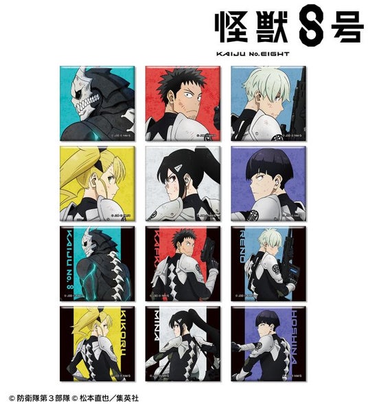 怪獣8号、日比野カフカ、市川レノ、四ノ宮キコル、亜白ミナ、保科宗四郎の描き下ろしイラストをスクエア缶バッジに仕上げました。