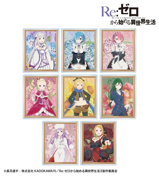 エミリア、レム、ラム、ベアトリス、フェルト、クルシュ・カルステン、アナスタシア・ホーシン、プリシラ・バーリエルのイラストを新たなタッチで魅力的に表現し、アクリルカードに仕上げました。