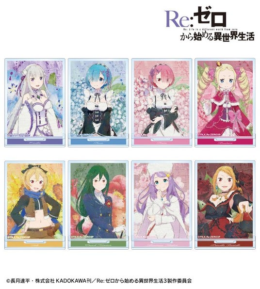エミリア、レム、ラム、ベアトリス、フェルト、クルシュ・カルステン、アナスタシア・ホーシン、プリシラ・バーリエルのイラストを新たなタッチで魅力的に表現し、アクリルスタンドに仕上げました。