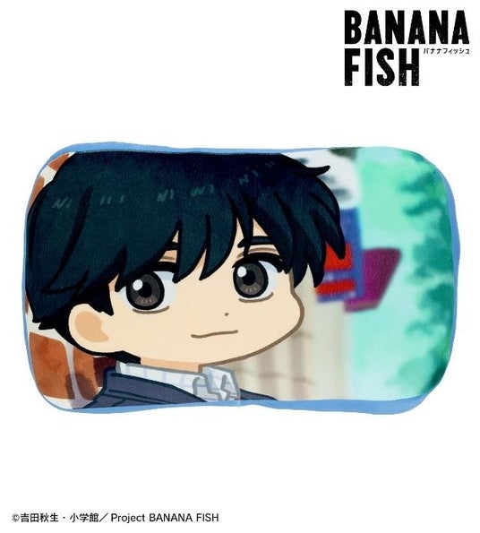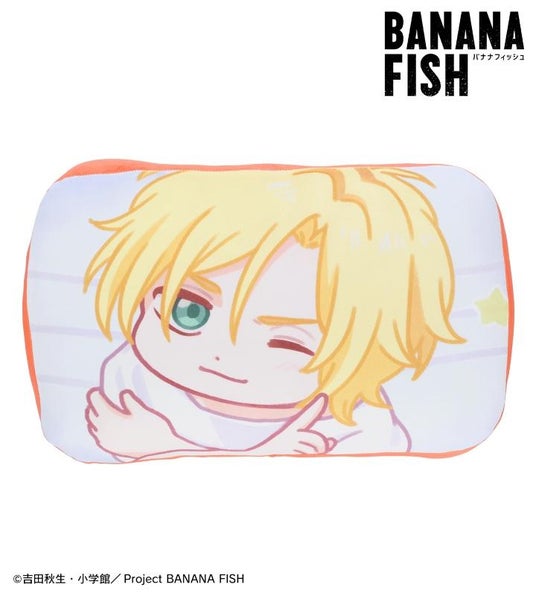 アッシュ・リンクス、奥村英二の印象的なシーンのゆるコマイラストと作品ロゴを、クッションに仕上げました。