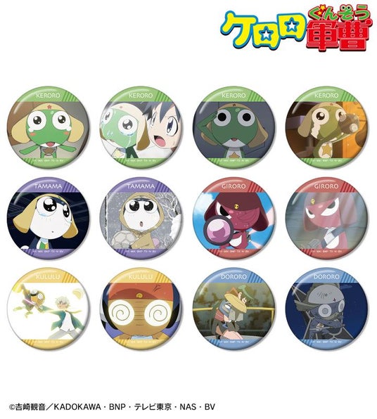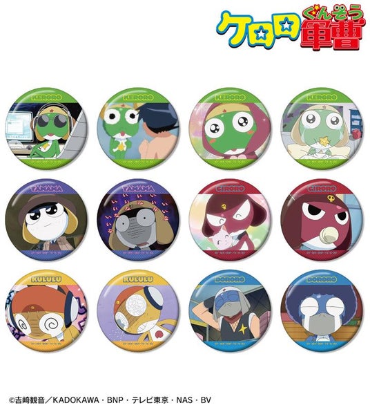 ケロロ、タママ、ギロロ、クルル、ドロロの印象的なシーンを缶バッジに仕上げました。