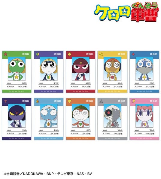 ケロロ、タママ、ギロロ、クルル、ドロロ、ガルル、タルル、トロロ、ゾルル、プルルのイラストとキャラクターのマークを、隊員証風のアクリルカードに仕上げました。