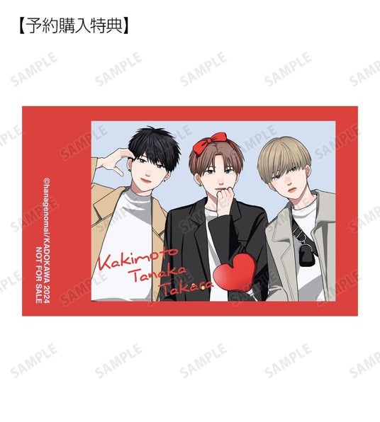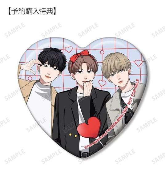 当商品を1BOX、または単品にて1BOX相当数ご注文ごとに、予約購入特典として「はなげのまい先生 描き下ろし 柿本健&田中隼人&高良瞬 プリントシール風ver. ハート型缶バッジ AMNIBUS限定特典」を付属いたします。