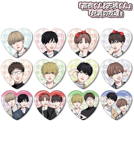 はなげのまい先生 描き下ろしイラストの高良瞬、天城太一、田中隼人、瀬川拓海、香取康介、山崎聡、柿本健、田中優也をハート型の缶バッジに仕上げました。