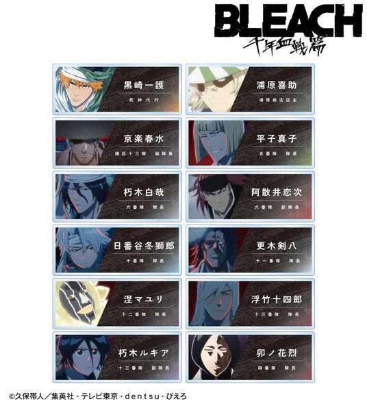 黒崎一護、浦原喜助、京楽春水、平子真子、朽木白哉、阿散井恋次、日番谷冬獅郎、更木剣八、涅マユリ、浮竹十四郎、朽木ルキア、卯ノ花烈の印象的なシーンをアクリルネームプレートに仕上げました。