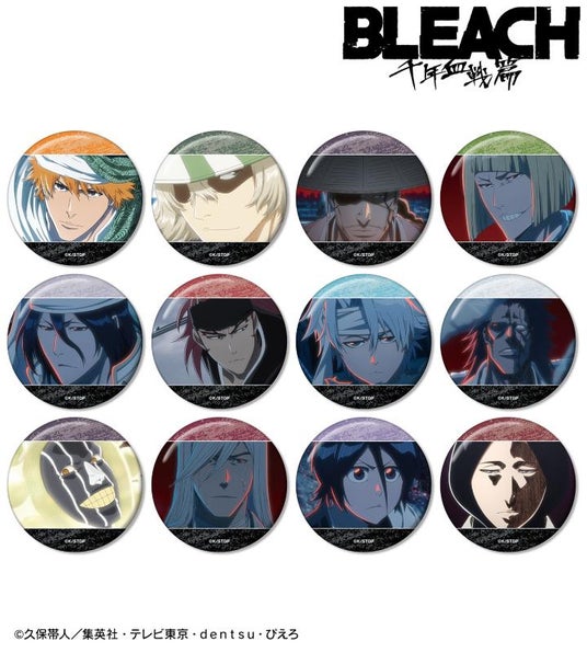 黒崎一護、浦原喜助、京楽春水、平子真子、朽木白哉、阿散井恋次、日番谷冬獅郎、更木剣八、涅マユリ、浮竹十四郎、朽木ルキア、卯ノ花烈の印象的なシーンを缶バッジに仕上げました。