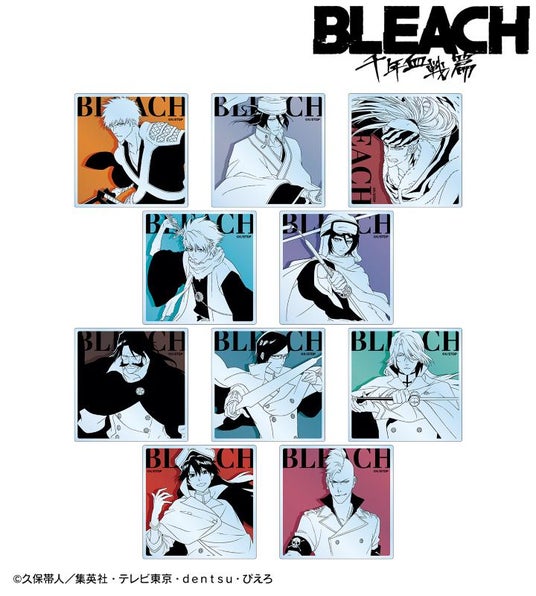 黒崎一護、朽木白哉、阿散井恋次、日番谷冬獅郎、朽木ルキア、ユーハバッハ、石田雨竜、ユーグラム・ハッシュヴァルト、バンビエッタ・バスターバイン、バズビーのイラストを、キャラクターカラーをアクセントにしたアクリルコースターに仕上げました。