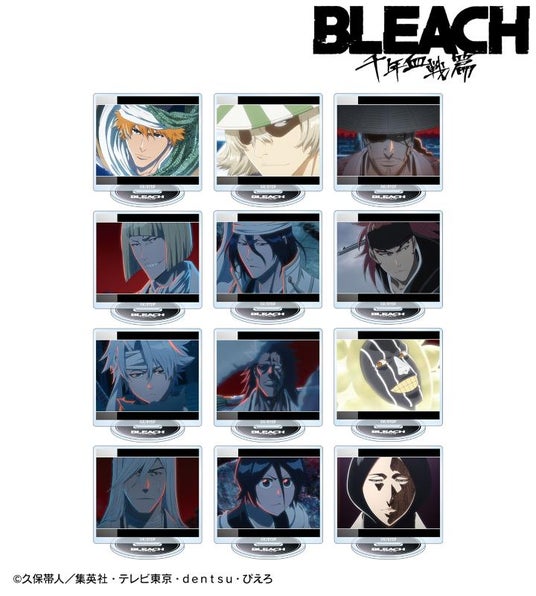 黒崎一護、浦原喜助、京楽春水、平子真子、朽木白哉、阿散井恋次、日番谷冬獅郎、更木剣八、涅マユリ、浮竹十四郎、朽木ルキア、卯ノ花烈の印象的なシーンをアクリルスタンドに仕上げました。