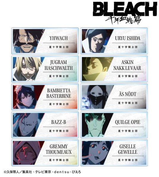 ユーハバッハ、石田雨竜、ユーグラム・ハッシュヴァルト、アスキン・ナックルヴァール、バンビエッタ・バスターバイン、エス・ノト、バズビー、キルゲ・オピー、グレミィ・トゥミュー、ジゼル・ジュエルの印象的なシーンをアクリルカードに仕上げました。