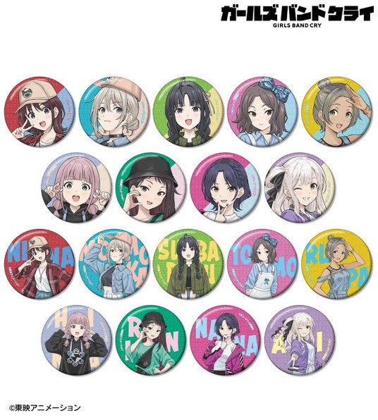 井芹 仁菜、河原木 桃香、安和 すばる、海老塚 智、ルパ、ヒナ、リン、ナナ、アイの描き起こしちびキャライラストをメインにデザインし、グリッター加工を施した缶バッジに仕上げました。