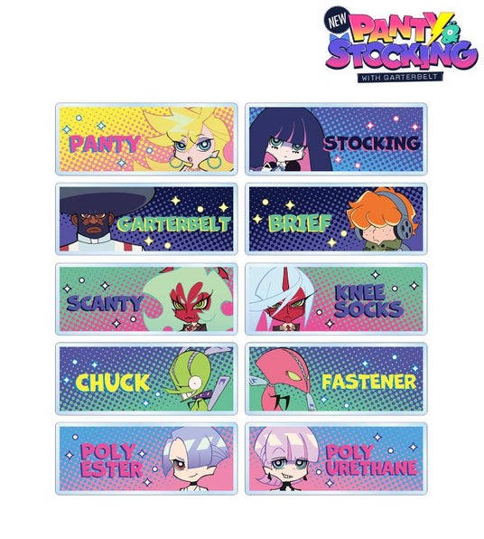 パンティ、ストッキング、ガーターベルト、ブリーフ、スキャンティ、ニーソックス、チャック、ファスナー、ポリエステル、ポリウレタンのイラストをアクリルネームプレートに仕上げました。