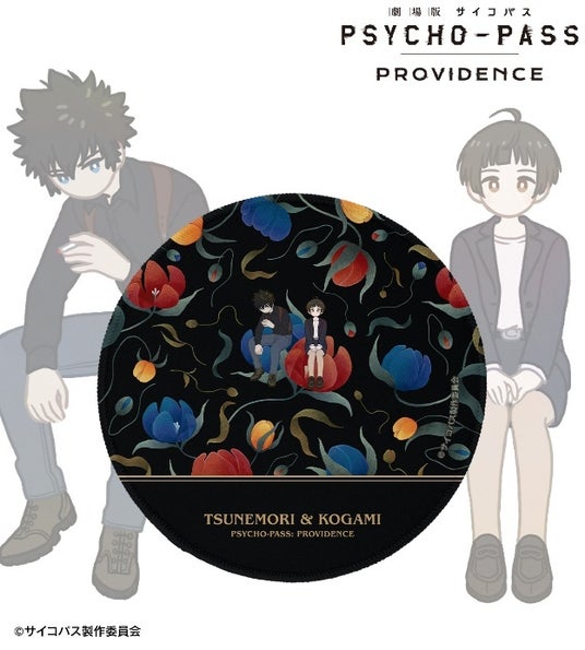 常守 朱、狡噛 慎也、宜野座 伸元のイラスト、作品名、キャラクターの名前をボタニカルデザインに落とし込んで繊細なタッチで新たに描き起こし、マウスパッドに仕上げました。