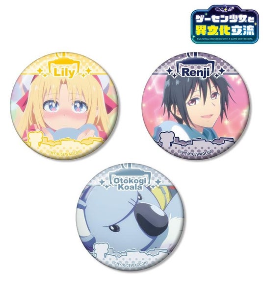 リリー・ベイカー、草壁蓮司、漢気コアラ、草壁葵衣、加賀花梨の印象的なシーンを缶バッジ3個セットに仕上げました。