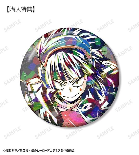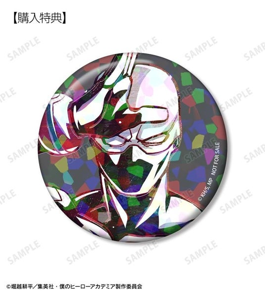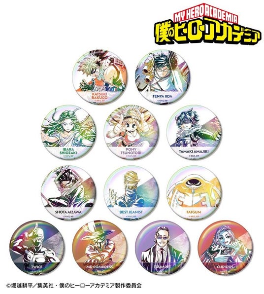 爆豪勝己、飯田天哉、塩崎茨、角取ポニー、天喰環、相澤消太、ベストジーニスト、ファットガム、トゥワイス、Mr.コンプレス、トランペット、キュリオスのビジュアルを新たなタッチで魅力的に表現し、オーロラ加工を施した缶バッジに仕上げました。