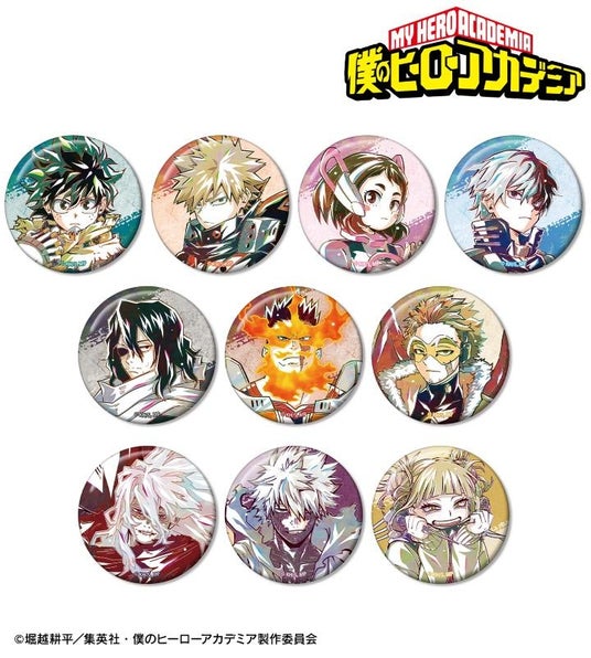 緑谷出久、麗日お茶子、蛙吹梅雨、常闇踏陰、物間寧人、拳藤一佳、オールマイト、ホークス、死柄木弔のビジュアルを新たなタッチで魅力的に表現し、オーロラ加工を施した缶バッジに仕上げました。