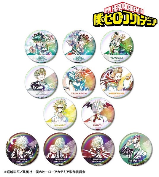 緑谷出久、蛙吹梅雨、物間寧人、拳藤一佳、通形ミリオ、オールマイト、リューキュウ、死柄木弔、リ・デストロのビジュアルを新たなタッチで魅力的に表現し、オーロラ加工を施した缶バッジに仕上げました。