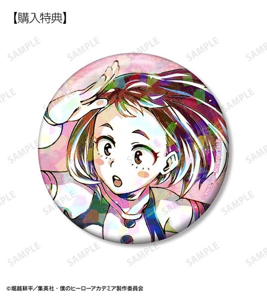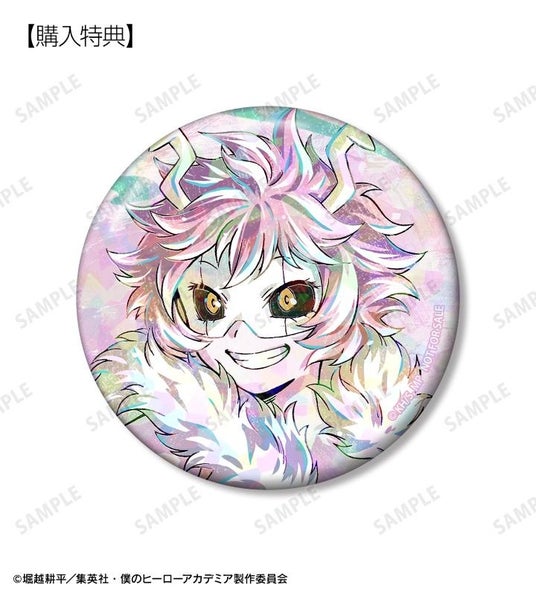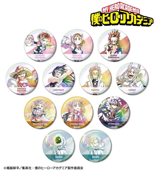 麗日お茶子、切島鋭児郎、小森希乃子、ミッドナイト、ホークス、ミルコ、トガヒミコ、オーバーホール、外典のビジュアルを新たなタッチで魅力的に表現し、オーロラ加工を施した缶バッジに仕上げました。