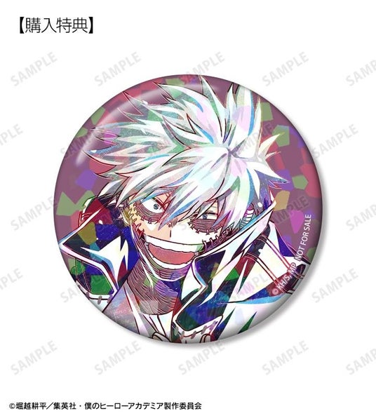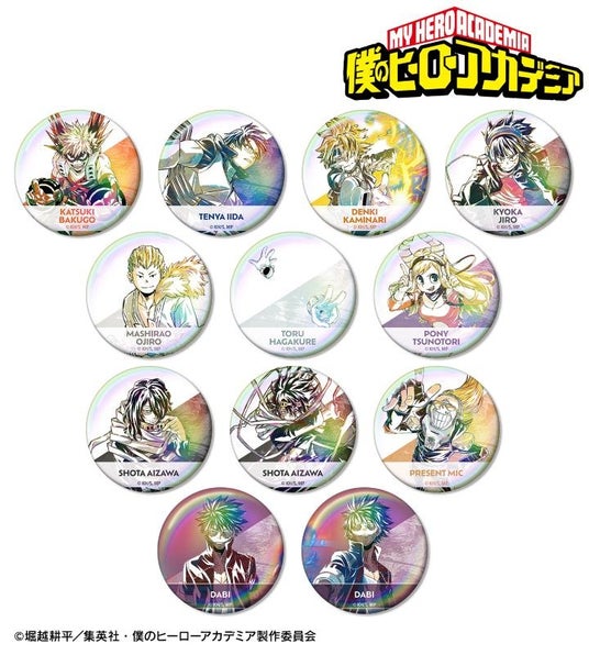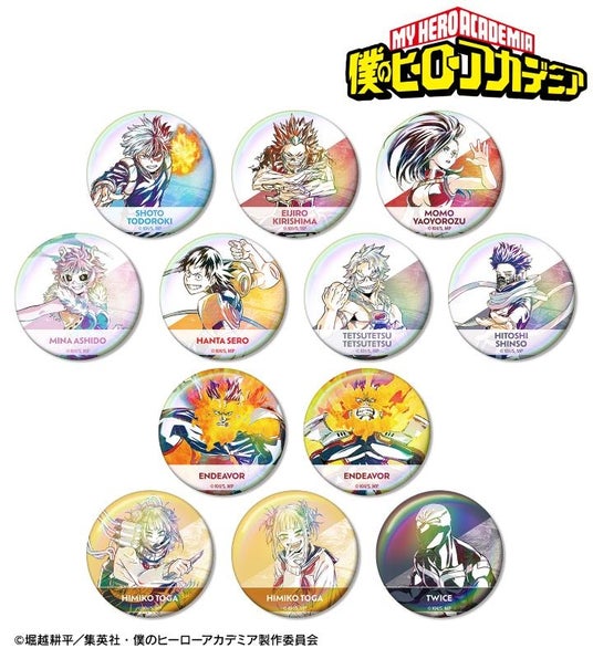 轟焦凍、切島鋭児郎、八百万百、芦戸三奈、瀬呂範太、鉄哲徹鐵、心操人使、エンデヴァー、トガヒミコ、トゥワイスのビジュアルを新たなタッチで魅力的に表現し、オーロラ加工を施した缶バッジに仕上げました。