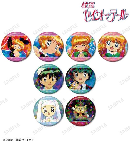怪盗セイント・テール、羽丘芽美、アスカJr.、深森聖良、ルビィの印象的なシーンをホログラム加工を施した缶バッジに仕上げました。
