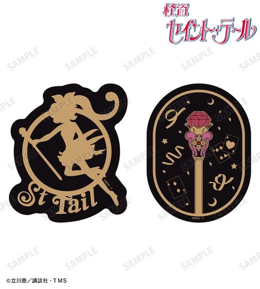 怪盗セイント・テールのシルエット、セイントイリュージョンステッキ、風船、セイントリボン、シルクハット、オルゴールペンダントのモチーフをダイカットのステッカー2個セットに仕上げました。