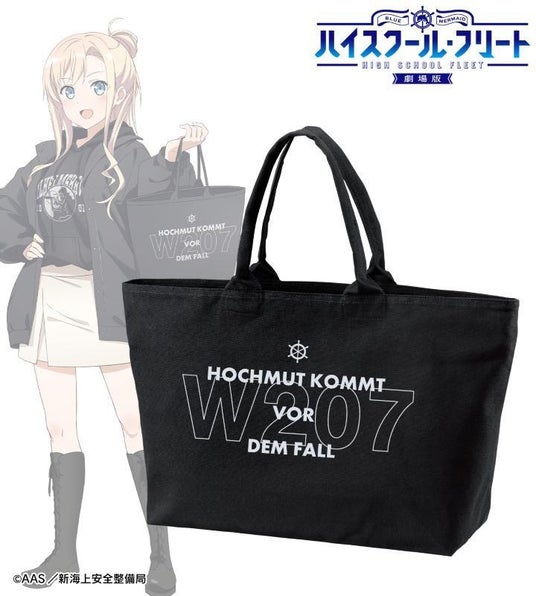 納沙 幸子の好きな言葉「ゆりかごの中で覚えたことは墓場まで忘れない」、晴風の「Y469」、ヴィルヘルミーナの好きな言葉「Hochmut kommt vor dem Fall」、アドミラル・グラフ・シュペーの「W207」をBIGなジップトートバッグに仕上げました。