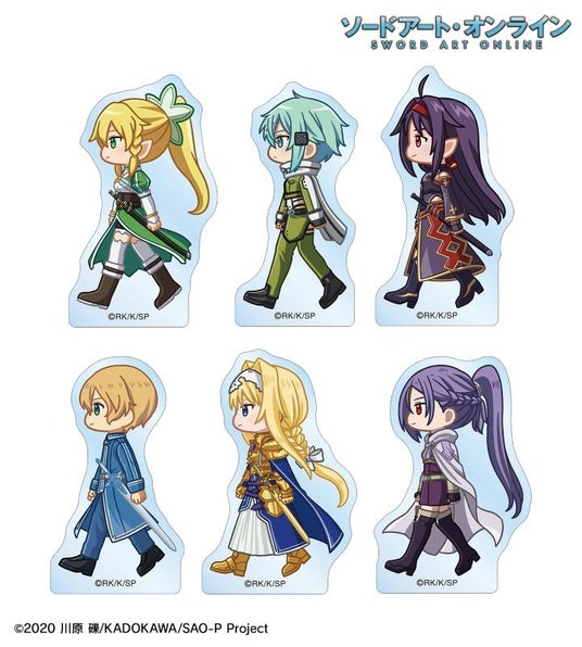 リーファ、シノン、ユウキ、ユージオ、アリス、ミトが歩いているちびキャラを新たに描き起こし、アクリルマスコットに仕上げました。