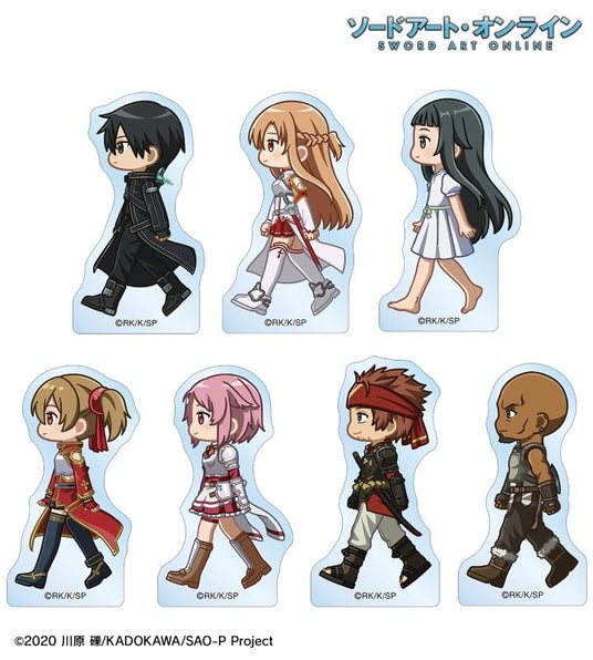 キリト、アスナ、ユイ、シリカ、リズベット、クライン、エギルが歩いているちびキャラを新たに描き起こし、アクリルマスコットに仕上げました。