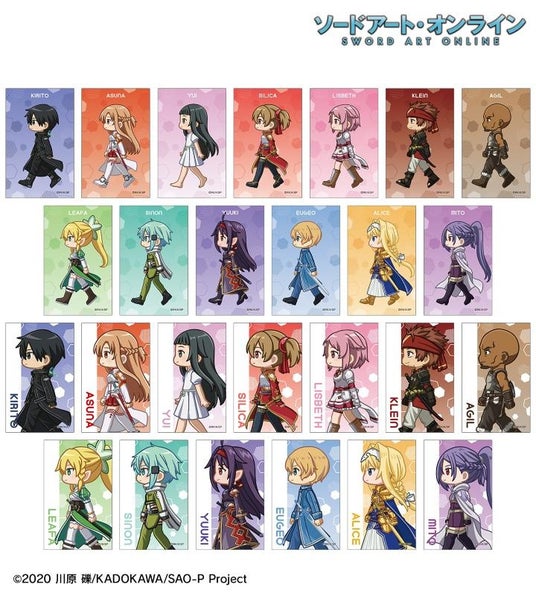 キリト、アスナ、ユイ、シリカ、リズベット、クライン、エギル、リーファ、シノン、ユウキ、ユージオ、アリス、ミトが歩いているちびキャラを新たに描き起こし、イラストカードに仕上げました。