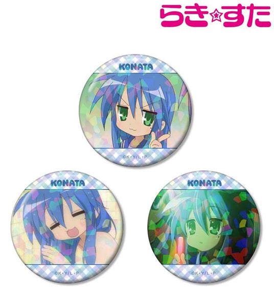 泉こなた、柊つかさ、柊かがみ、高良みゆきの印象的なシーンをホログラム加工を施した缶バッジ3個セットに仕上げました。