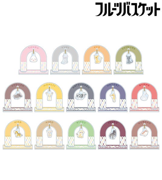 本田透、草摩由希、草摩夾、草摩紫呉、草摩楽羅、草摩紅葉、草摩潑春、草摩はとり、草摩綾女、草摩杞紗、草摩燈路、草摩利津、草摩依鈴、草摩紅野が動物に変身した姿の描き起こしちびキャライラストをメインにゆらゆら動くアクリルスタンドに仕上げました。