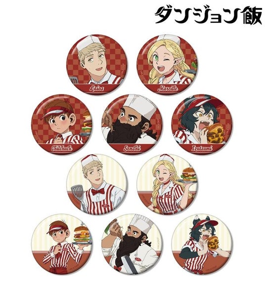 ライオス、マルシル、チルチャック、センシ、イヅツミの描き下ろしイラストをBIGな缶バッジに仕上げました。