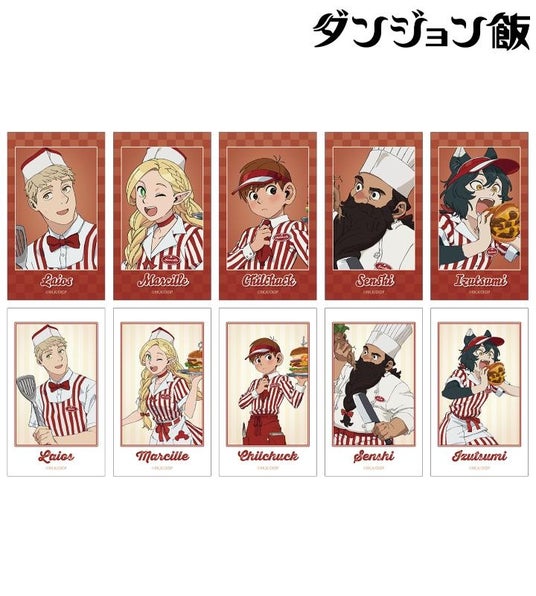 ライオス、マルシル、チルチャック、センシ、イヅツミの描き下ろしイラストをインスタントカメラで撮影したようなデザインのイラストカードに仕上げました。