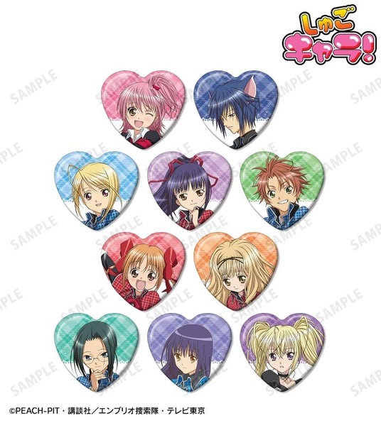 日奈森 あむ、月詠 イクト、辺里 唯世、藤咲 なでしこ、相馬 空海、結木 やや、真城 りま、三条 海里、藤咲 なぎひこ、ほしな 歌唄のイラストをハート型の缶バッジに仕上げました。