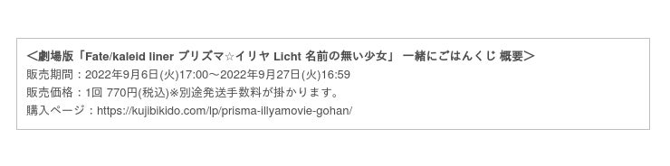 株式会社KADOKAWA(本社:東京都千代田区、代表取締役社長:夏野 剛 以下KADOKAWA)は、運営するオンラインくじサービス「くじ引き堂」において、劇場版「Fate/kaleid liner プリズマ☆イリヤ Licht 名前の無い少女」オリジナル商品が手に入る『劇場版「Fate/kaleid liner プリズマ☆イリヤ Licht 名前の無い少女」一緒にごはんくじ』を、2022年9月6日(火)17時より販売します。