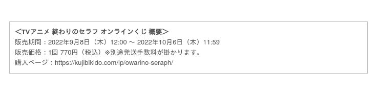 株式会社KADOKAWA株式会社KADOKAWA(本社:東京都千代田区、代表取締役社長:夏野 剛 以下KADOKAWA)は、運営するオンラインくじサービス「くじ引き堂」において、オリジナル商品が手に入る「TVアニメ『終わりのセラフ』オンラインくじ」を、2022年9月8日(木)12時より販売開始致します。
