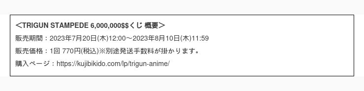 株式会社KADOKAWA(本社:東京都千代田区、取締役 代表執行役社長 CEO:夏野剛、以下 KADOKAWA)は、運営するオンラインくじサービス「くじ引き堂」において、TVアニメ『TRIGUN STAMPEDE』オリジナル商品が手に入る<TRIGUN STAMPEDE 6,000,000$$くじ>を、2023年7月20日(木)12時より販売します。