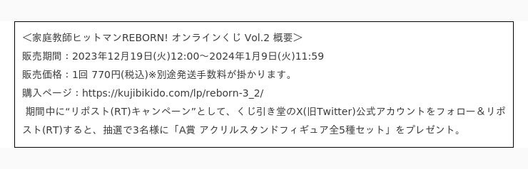 株式会社KADOKAWA株式会社KADOKAWA(本社:東京都千代田区、取締役 代表執行役社長 CEO:夏野 剛、以下 KADOKAWA)は、運営するオンラインくじサービス「くじ引き堂」において、TVアニメ「家庭教師ヒットマンREBORN!」オリジナル商品が手に入る<家庭教師ヒットマンREBORN! オンラインくじ Vol.2>を、2023年12月19日(火)12時より販売します。