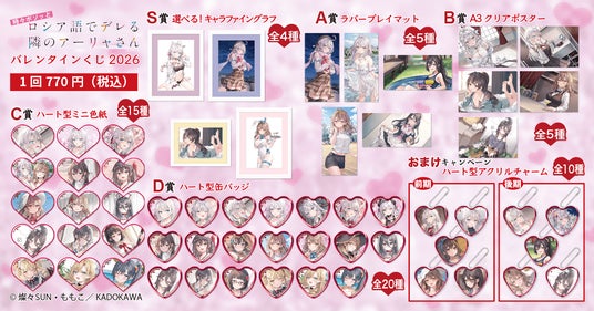 株式会社KADOKAWA(本社:東京都千代田区、取締役 代表執行役社長 CEO:夏野 剛、以下 KADOKAWA)は、運営するオンラインくじサービス「くじ引き堂」において、『時々ボソッとロシア語でデレる隣のアーリャさん』の豪華賞品が手に入る<『時々ボソッとロシア語でデレる隣のアーリャさん』バレンタインくじ2026>を、2026年2月14日(土)12時より販売します。