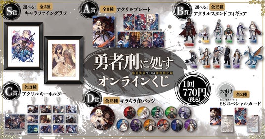 株式会社KADOKAWA(本社:東京都千代田区、取締役 代表執行役社長 CEO:夏野 剛、以下 KADOKAWA)は、運営するオンラインくじサービス「くじ引き堂」において、『勇者刑に処す 懲罰勇者9004隊刑務記録』の豪華賞品が手に入る<『勇者刑に処す 懲罰勇者9004隊刑務記録』オンラインくじ>を、2026年3月26日(木)12時より販売します。賞品は美麗な原作イラストを使用。他にもアニメ化を記念した特別なイラストを使用した賞品など、ときめくラインナップとなっております。また、期間中に“リポストキャンペーン”として、くじ引き堂のX公式アカウントをフォロー&リポストすると、抽選で3名様に「B賞 アクリルスタンドフィギュア全12種セット」をプレゼント。この機会をお見逃しなく!!